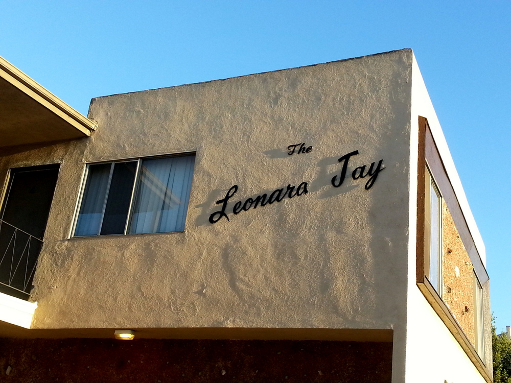 My neighborhood is filled with amusing apartment names which I regularly admire and contemplate on my walks. Many of the complexes were built in the 1950s and 60s and I can’t help but wonder how and why they got their names. Take for example the “Leonara Jay” Apartments below. Who was Leonara Jay?