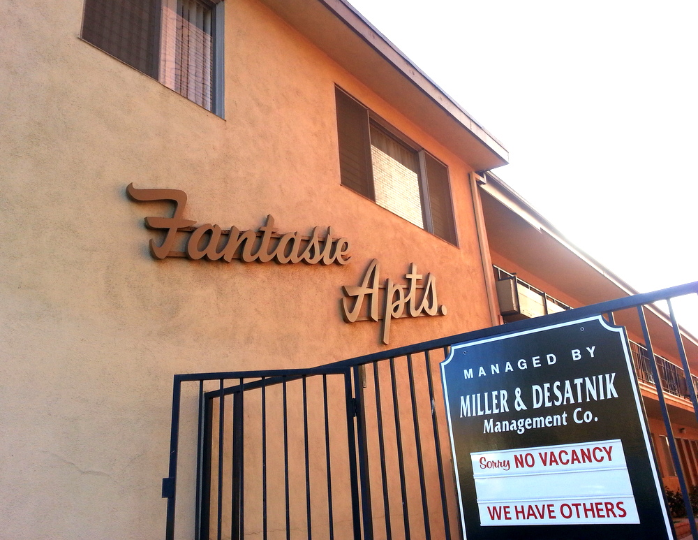 Recently, while walking down Motor Avenue, I happened upon the “Fantasie” Apartments. I have walked past this alleyway dozens of times and never noticed this sign. It seems unfortunate to me that such a beautiful sign would be stuffed between two buildings, certainly lessening the possibility of this being anyone’s “fantasie.” I would imagine though that there was a day when this complex stood proud and alluring, newly built on Motor Avenue, just a stone’s throw from the glitz of Sony studios.